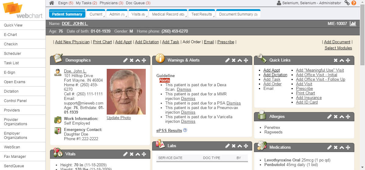 Searching for a patient’s chart still begins at the E-Chart tab. The overall look and feel of the patient search matches the new Enterprise Health styling, including the tabs. The E-Chart defaults to the Patient Summary page. The Patient Summary displays data in portlets much like the Quick View.