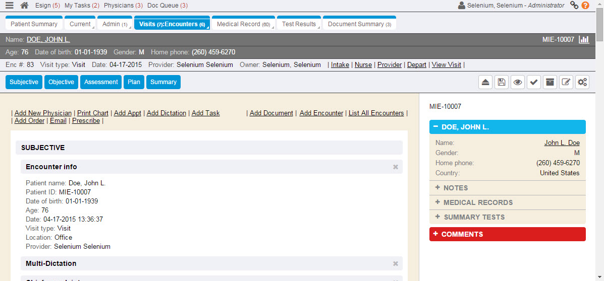 • The Encounter toolbar displays information and links to the open patient encounter.